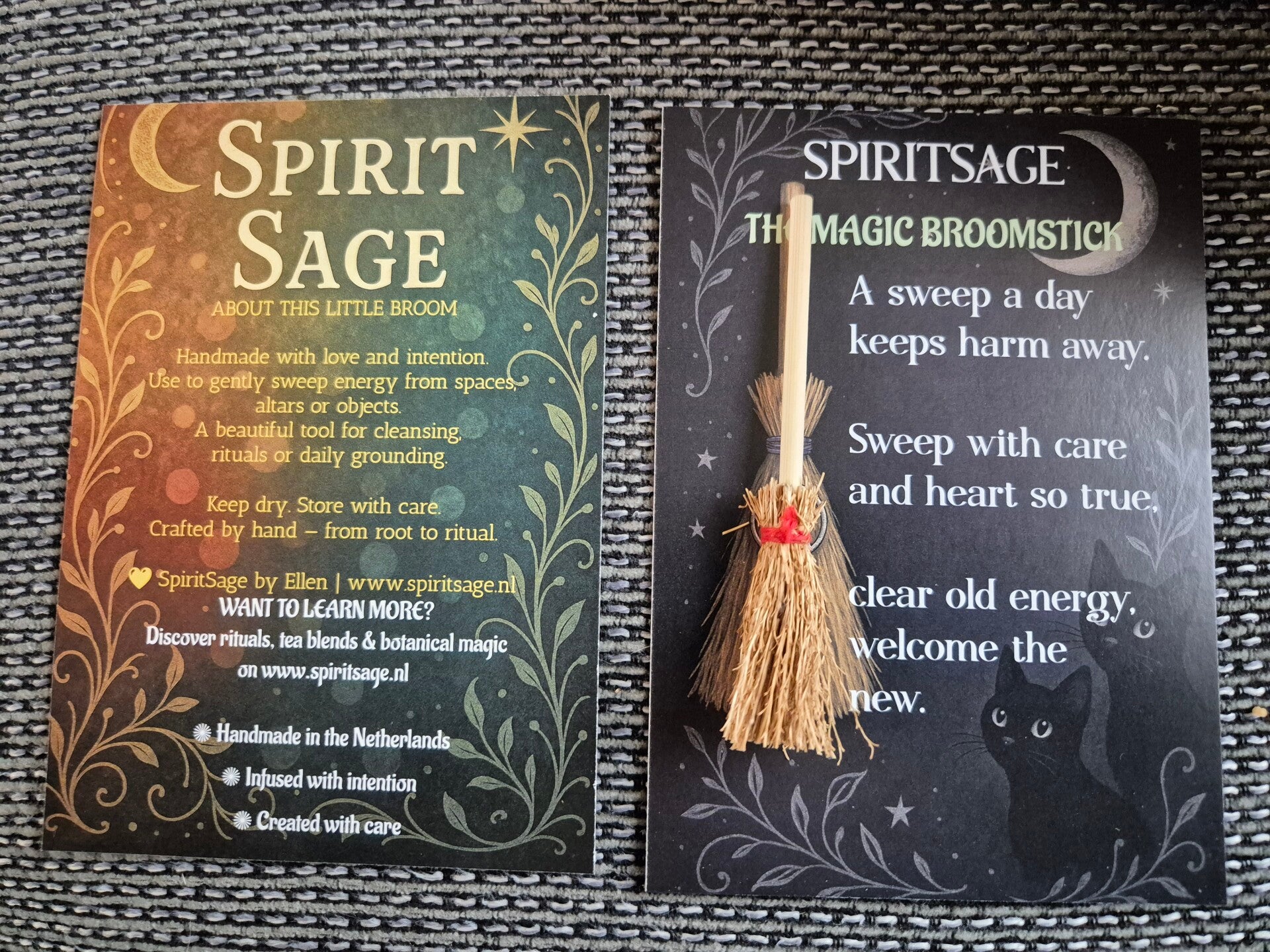 Een klein bezempje vol magie — handgemaakt met liefde, intentie en een vleugje kruidenvrouw-energie.